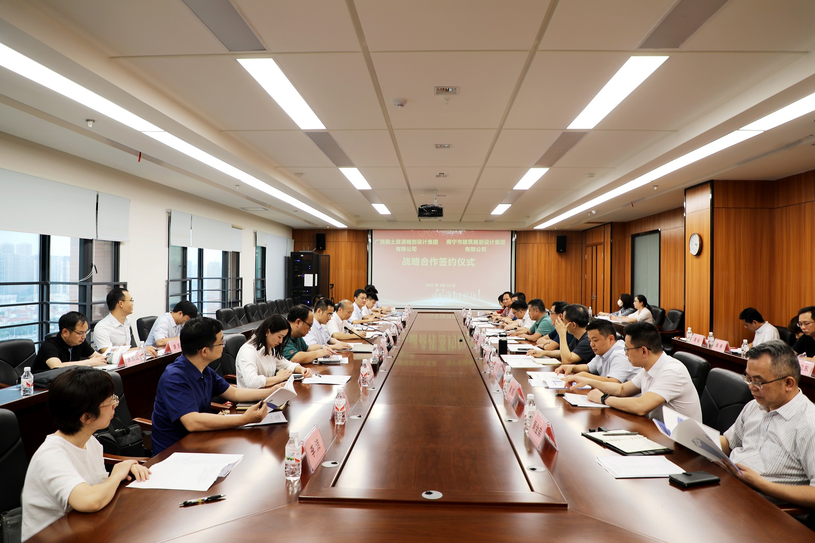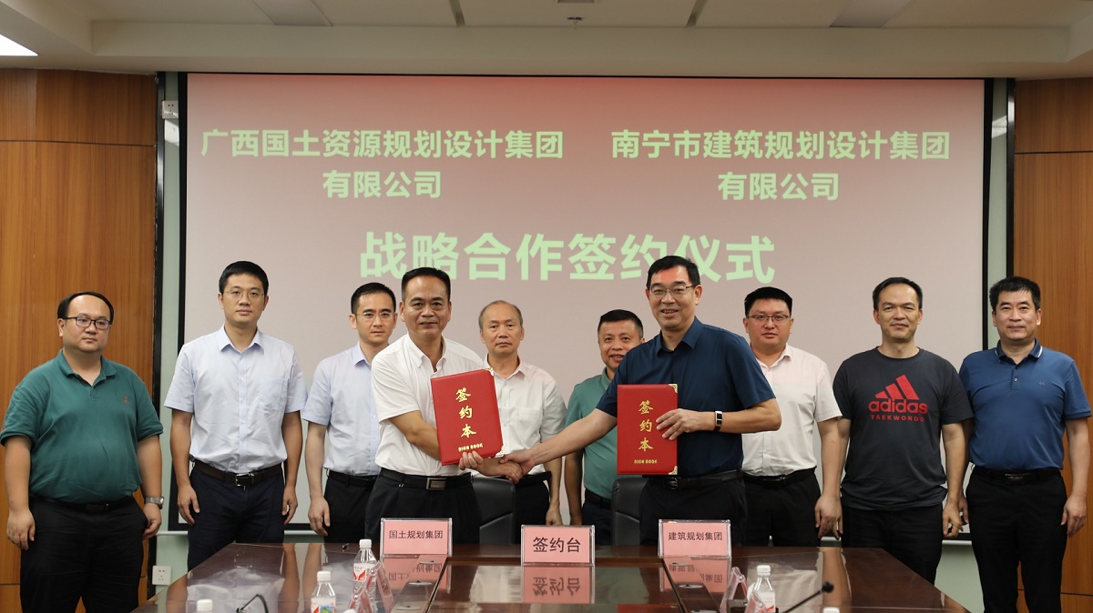 6月28日,南寧市建筑規(guī)劃設(shè)計集團有限公司與廣西國土資源規(guī)劃設(shè)計集團有限公司戰(zhàn)略合作簽約儀式在我集團舉行。集團黨委書記、董事長韋文學和廣西國土資源規(guī)劃設(shè)計集團黨委書記、董事長鄧強出席儀式并見證簽約,集團總經(jīng)理、副董事長馮江泉和廣西國土資源規(guī)劃設(shè)計集團總經(jīng)理、黨委副書記、副董事長魏玉平分別代表雙方簽訂戰(zhàn)略合作協(xié)議。
