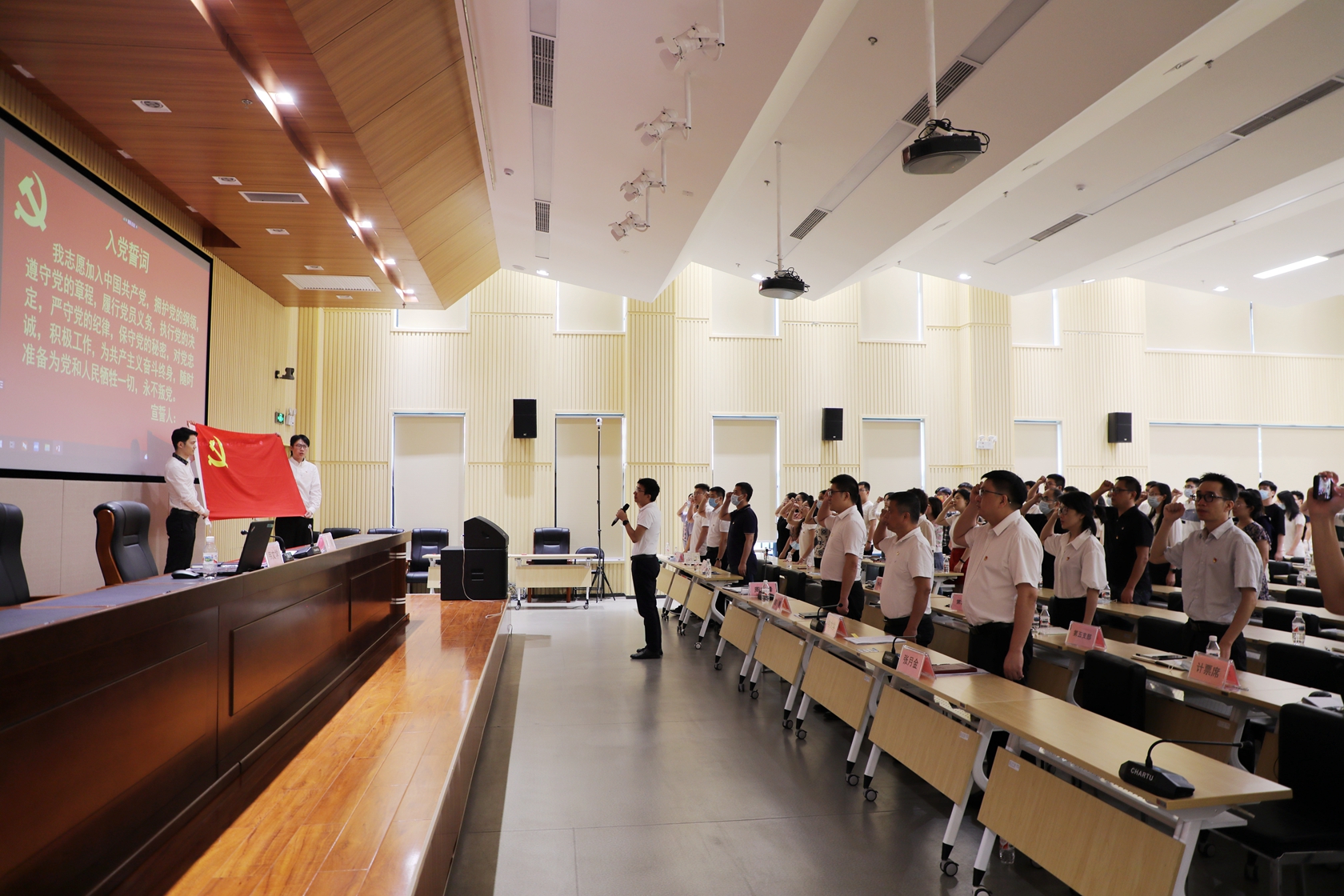 “我志愿加入中國共產(chǎn)黨,擁護黨的綱領(lǐng)……”錚錚誓言,拳拳初心。全體與會黨員面向鮮紅的黨旗,莊嚴地舉起右拳,用慷慨激昂的誓言重溫入黨時許下的莊嚴承諾,衷心表達對黨的絕對忠誠和為黨的事業(yè)奮斗終身的決心和愿望。